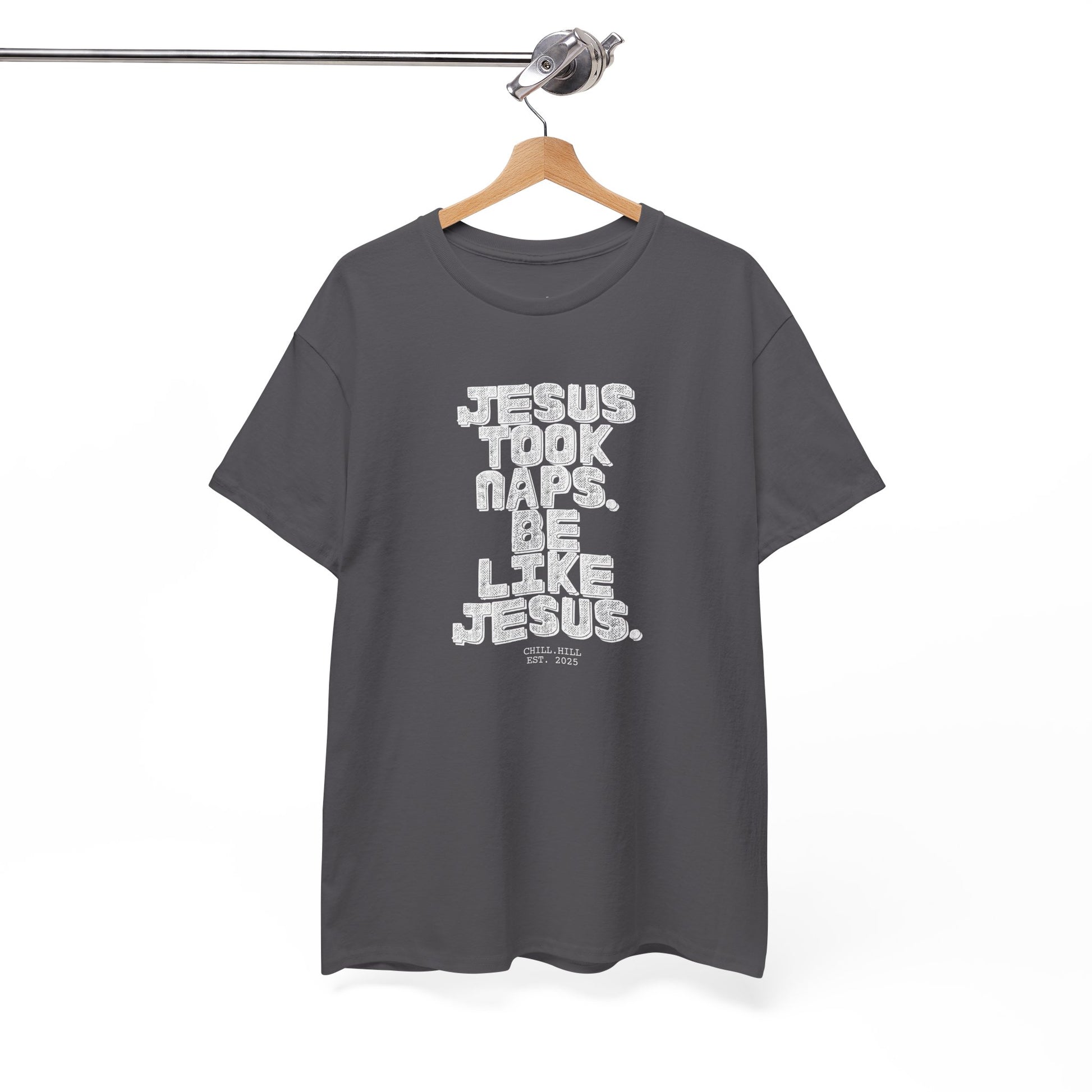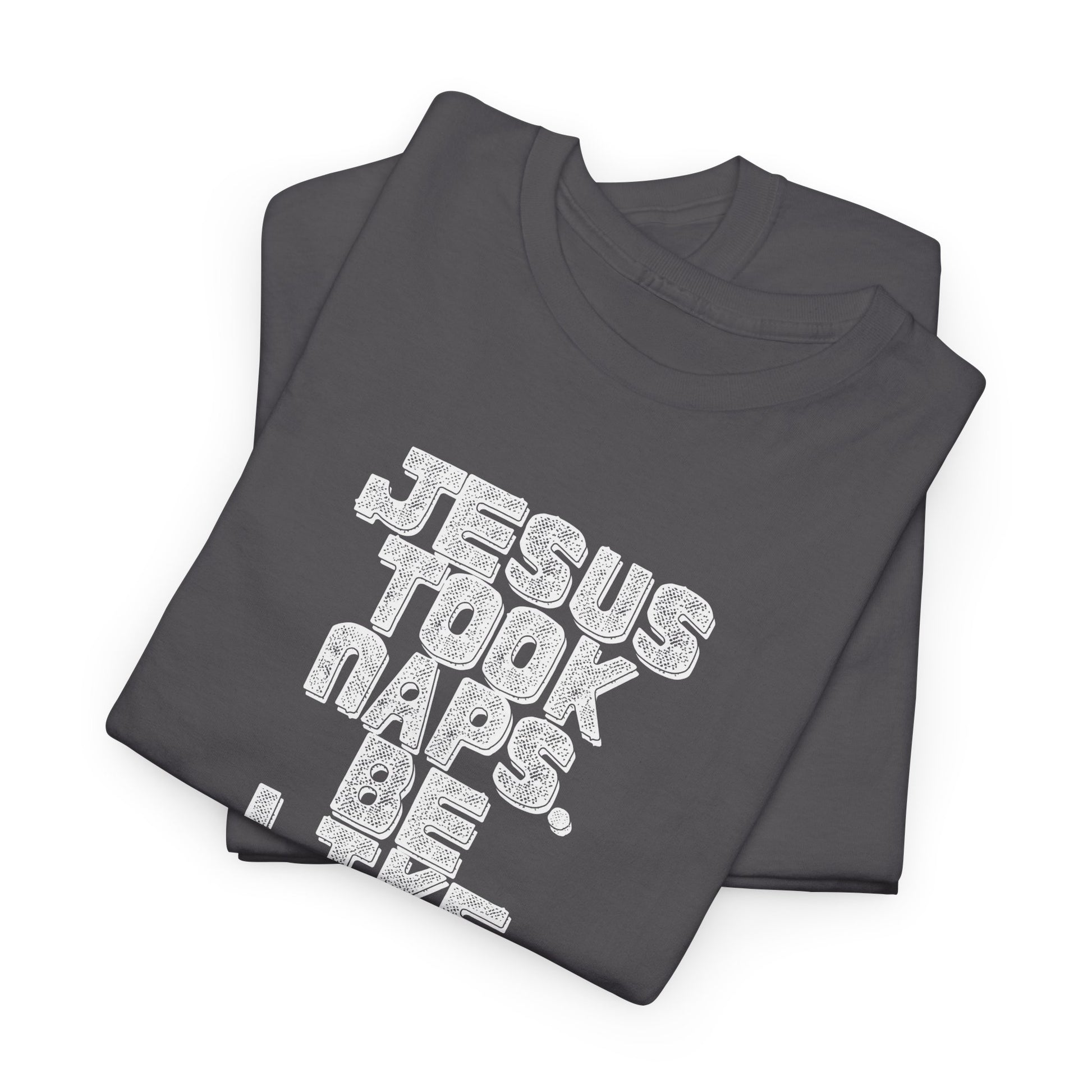 This T-Shirt features a fun and witty design that says 'Jesus Took Naps, Be Like Jesus'. It exudes a laid-back and humorous vibe, making it perfect for those who appreciate a touch of humor in their wardrobe. This tee is relevant for Christian holidays, casual wear, or as a gift for someone with a funny sense of humor.