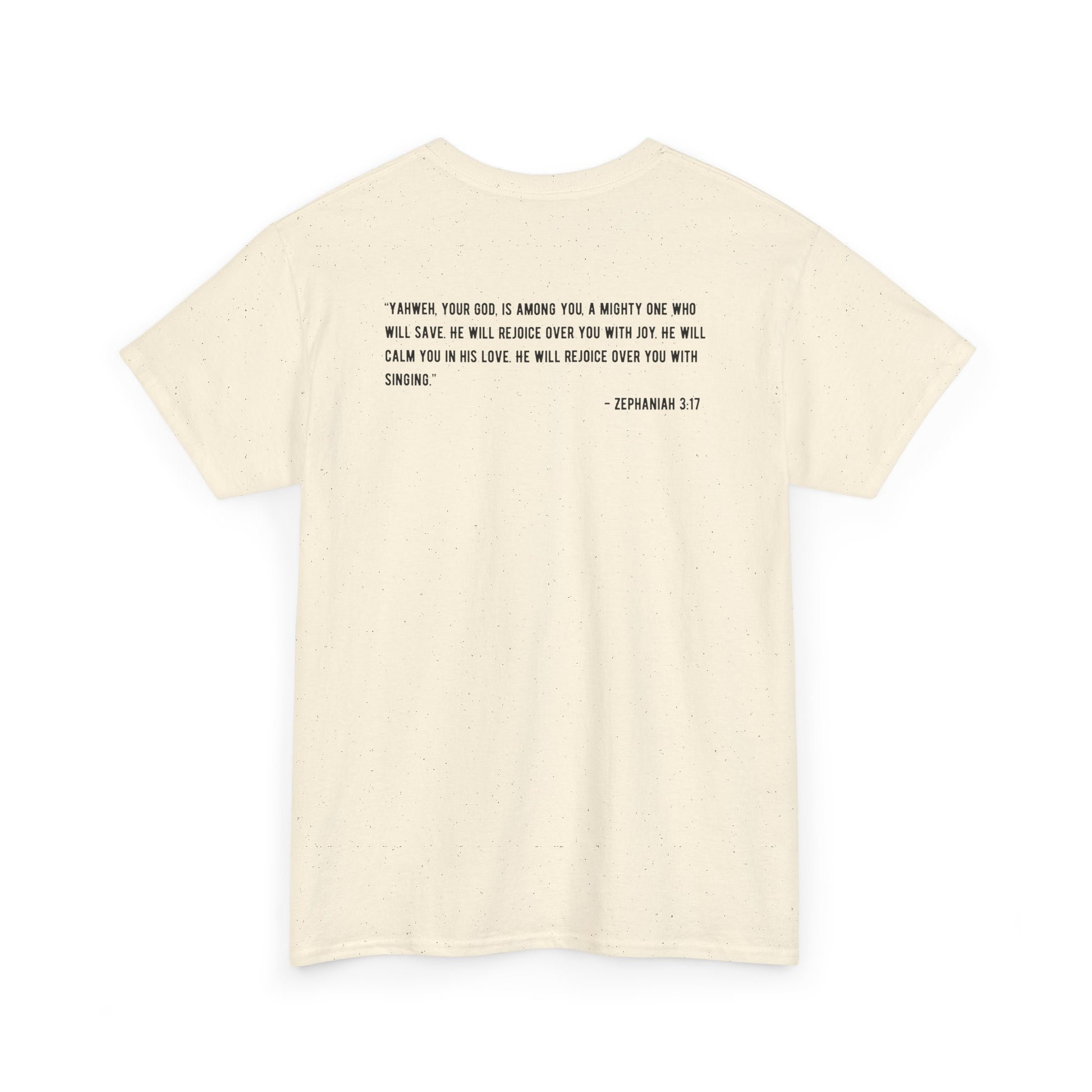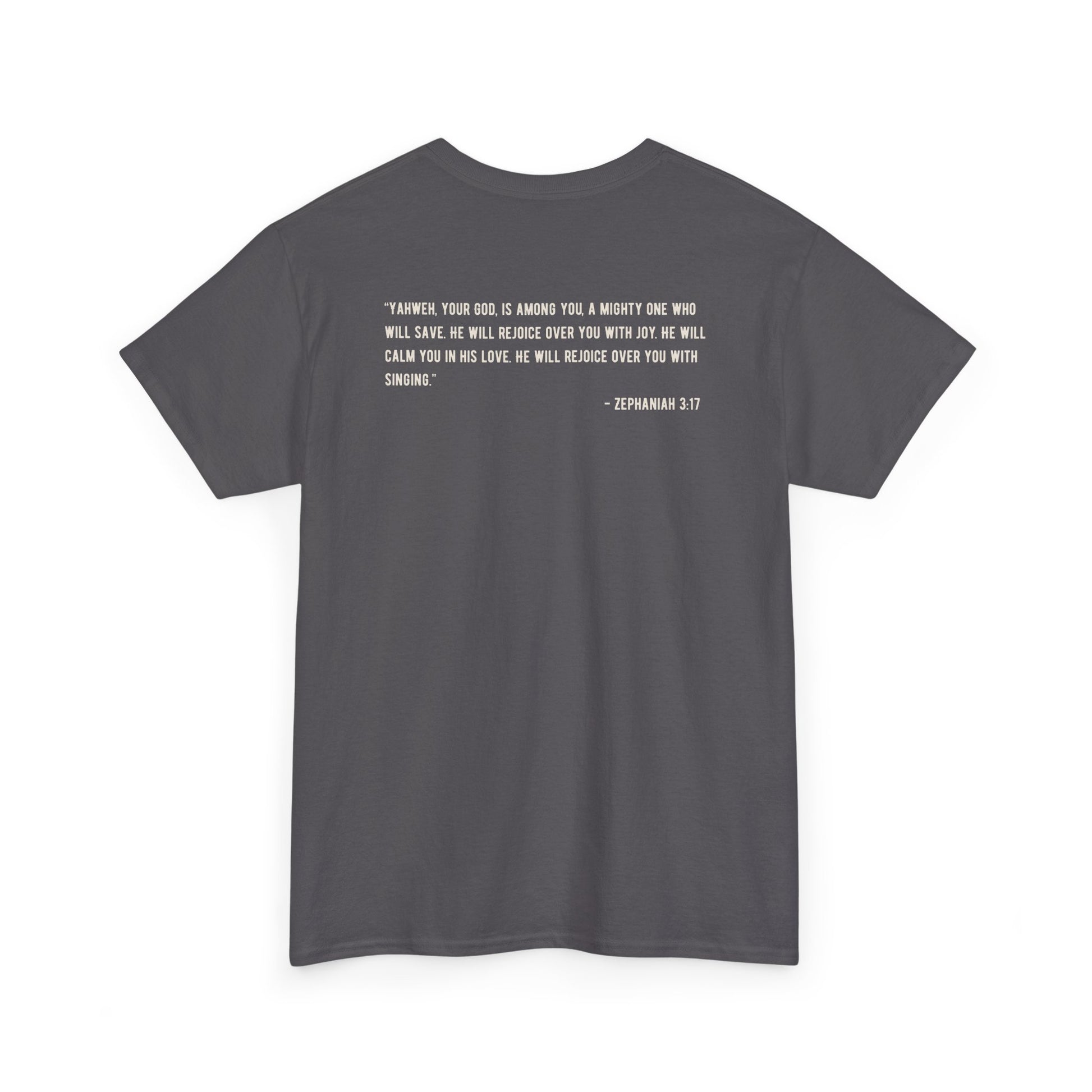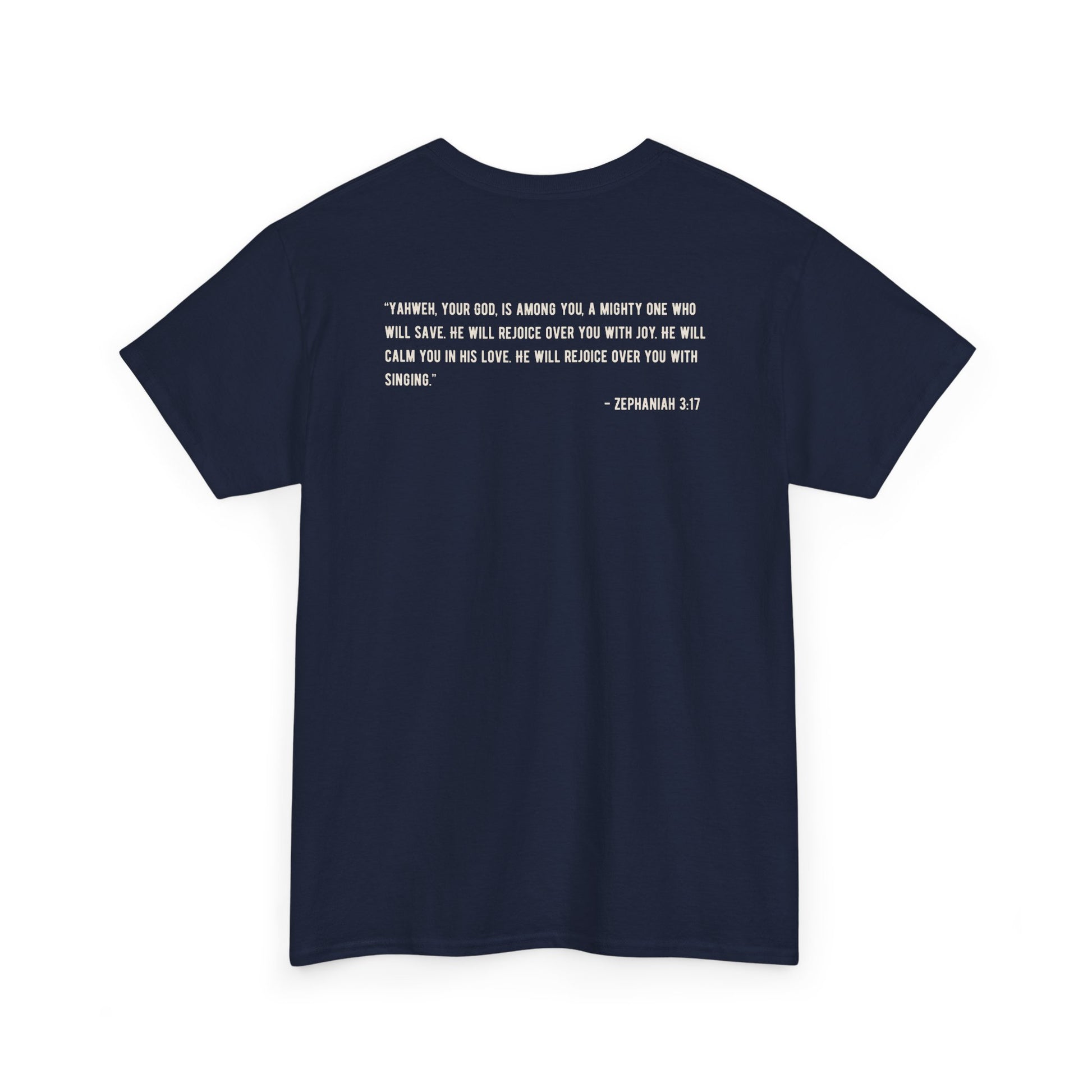 This tee features a quote from Zephaniah 3:17, making it a powerful statement piece. The classic fit and comfortable fabric make it ideal for everyday wear, and the ethical production process ensures quality and sustainability. Perfect for adults looking for a meaningful addition to their wardrobe.