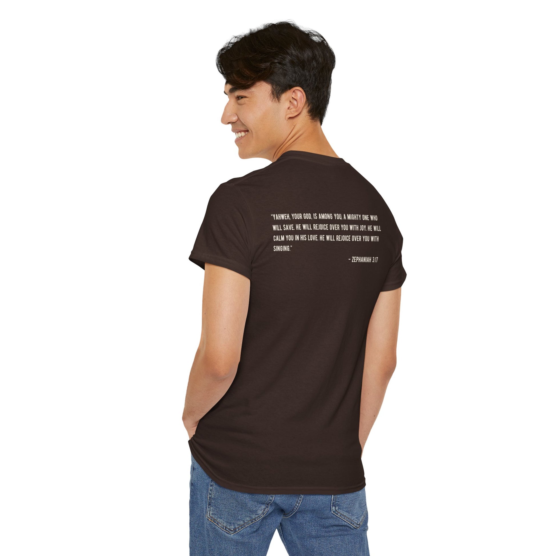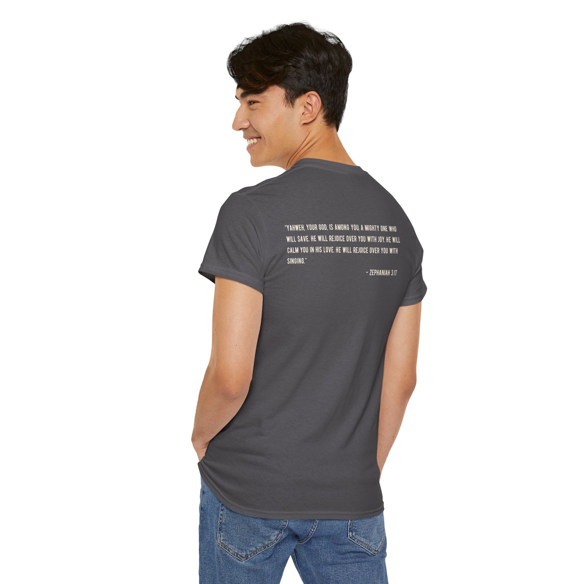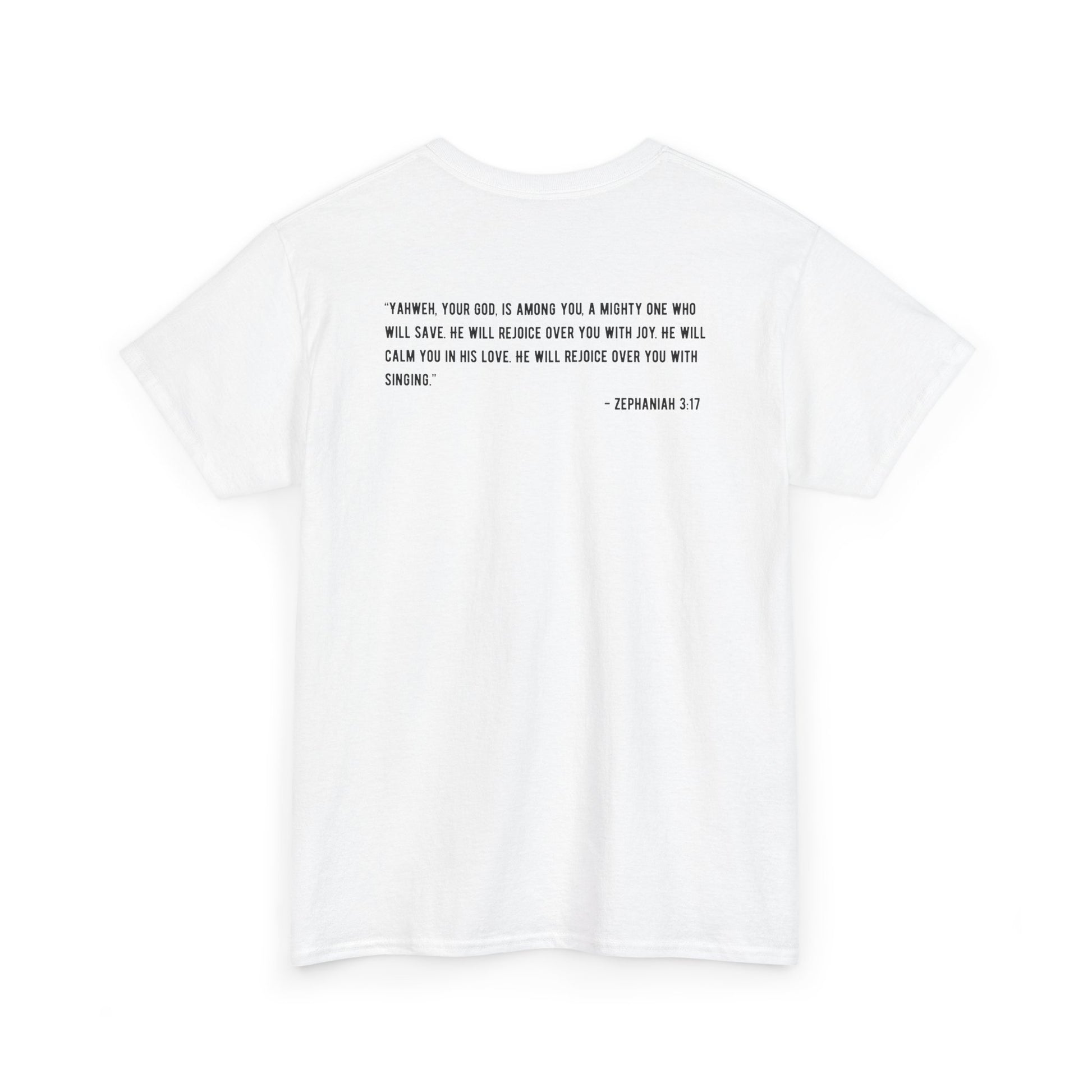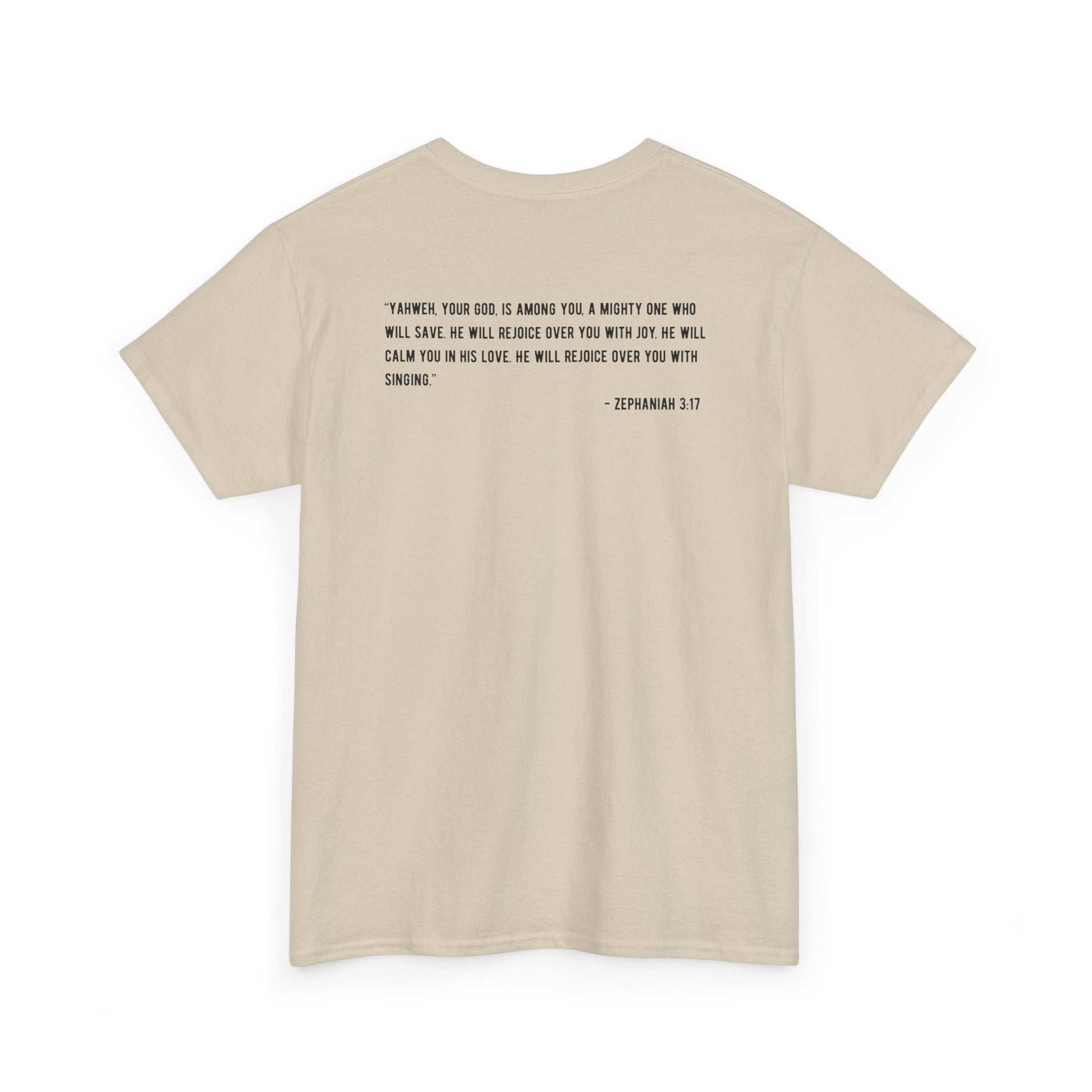 This tee features a quote from Zephaniah 3:17, making it a powerful statement piece. The classic fit and comfortable fabric make it ideal for everyday wear, and the ethical production process ensures quality and sustainability. Perfect for adults looking for a meaningful addition to their wardrobe.